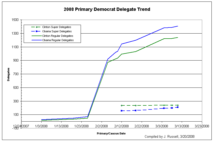 Daily Updated trend chart of Democratic delegates. democrat democratic delegate super delegate trend chart barack obama hillary clinton pledged delegates primary caucus